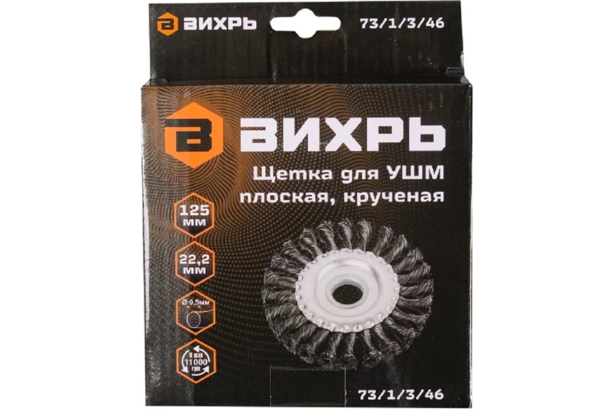 Щётка для УШМ плоская, крученая, 125 мм Вихрь – это сменная насадка для шлифовальной обработки поверхности. Изготовлена из упругих плетёных пучков из стальной проволоки. Предназначена для зачистки от лака, краски и коррозии, работы со сварочной окалиной, обработки материалов высокой плотности.