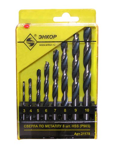 Набор Энкор 21178 из 8 сверл с цилиндрическим хвостовиком предназначен для сверления стали и цветных сплавов. Распространяются в пластиковом футляре с подписанными позициями. Сверла выполнены из быстрорежущей стали Р9К5.