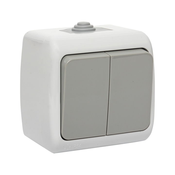 / Каталог / Электроустановочные изделия / Розетки и выключатели / Мурманск Выключатель 2-клавишный 10А IP54 серый EKF