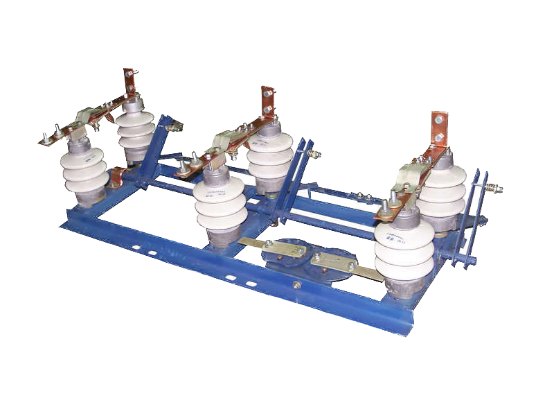 Рама разъединителя РЛНД – представляет собой сварную конструкцию, которая собрана из трех швеллеров, установленных параллельно. На швеллере рамы разъединителя РЛНД крепится поворотный изолятор, выполненный в виде вала и приваренного к нему рычага. На другом конце швеллера в разъединителе РЛНД устанавливается неподвижный изолятор. Его крепление осуществляется с помощью болтового соединения. Рычаги подвижных изоляторов в разъединителях РЛНД соединены друг с другом с помощью продольной тяги, она служит для одновременного синхронного поворота трех колонок.