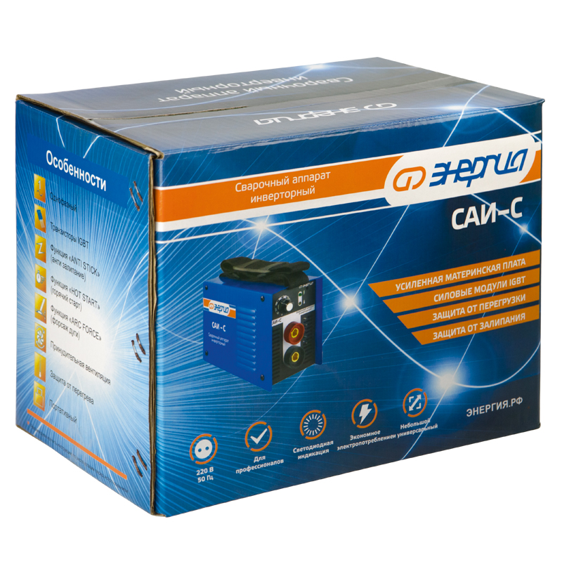 Сварочные аппараты инверторные «Энергия САИ - С» предназначены для ручной сварки электродами постоянным током. В основу работы прибора заложены современные технологии, обеспечивающие стабильное горение сварочной дуги, ее легкий поджиг, а также целый ряд других преимуществ.