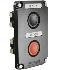 Кнопочный пост шириной 80 мм, высотой 150 мм и глубиной 72 мм, в котором толкателем выступает черная и красная кнопка.