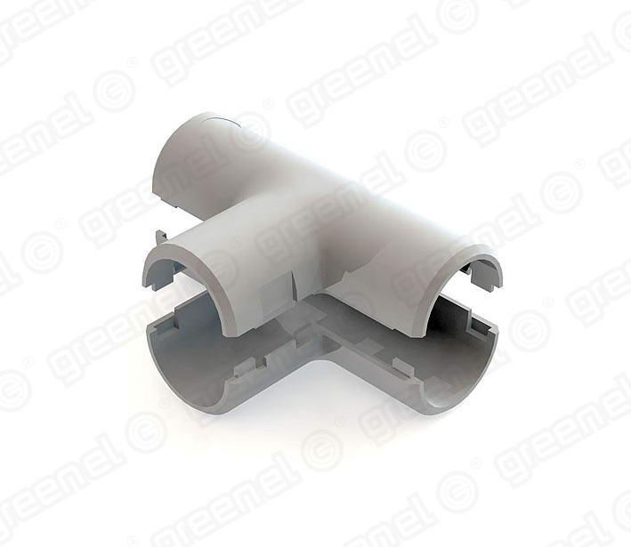 Тройник разъемный применяется для разветвления электропроводки и Т-образного соединения жестких гладких труб одинакового диаметра под угдом 900. Состоит из двух одинаковых частей, соединяющихся защелкиванием. Рекомендуется для использования в сухих помещениях.