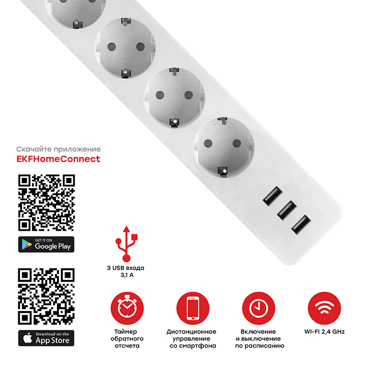 Умный удлинитель EKF HomeConnect Wi-Fi c USB